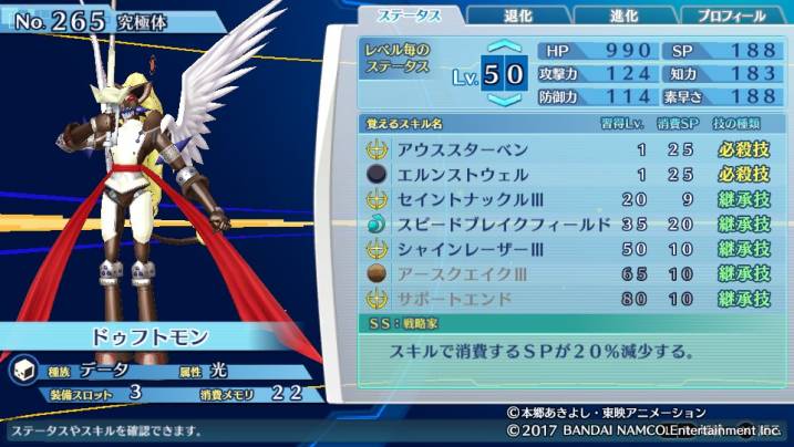| パーフェクトリバイブ | 消費SP48。他のデジモンより幾分か気楽に使う事ができる。 |