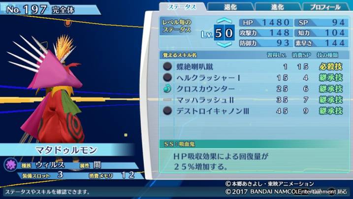 HPと攻撃力は中々高く、素早さも完全体の中では悪くない数字。他は流石に欲張れない。