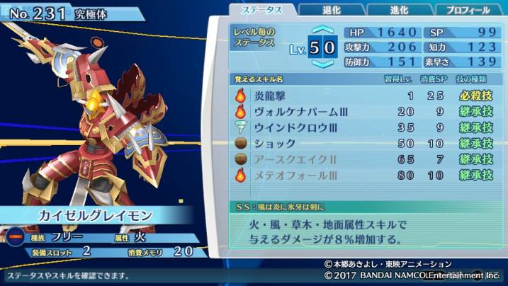 | ウォーグレイモン | 火属性攻撃+23%の補正が付いたガイアフォースと炎龍撃で敵を落としていく。 |