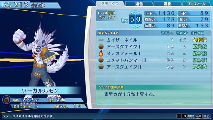 耐久振りの補助型で運用するならグラップレオモンに劣りやすいため、攻撃と素早さで勝っているのを活かしていきたい。