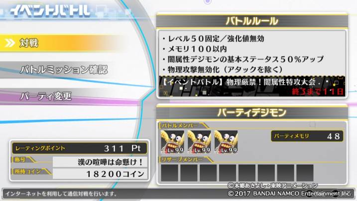 強化値、装備品は反映されますがデジモンのレベルは全て50に固定されます。