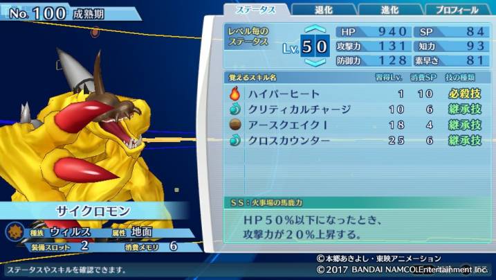 スロット、個性込みで攻撃に特化させた場合、単独でも攻撃力が脅威の400を突破。継承技で強引に究極体を落としに行けるレベルである。