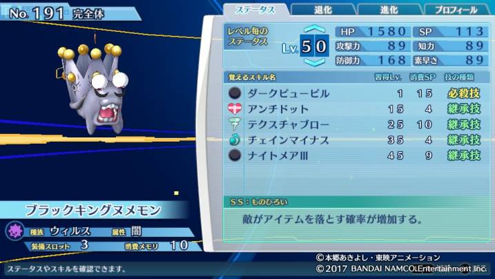 SSは『ものひろい』。デジモンメダルの中には敵からのドロップ限定の物がある。何戦も戦うのがつらい時は輝くかもしれないゾ★