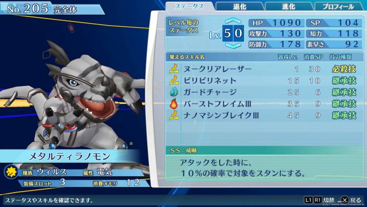 ちなみにデスメラモンはSS『不動』持ちであり、メタルティラノモンの『威嚇』を完封できる。