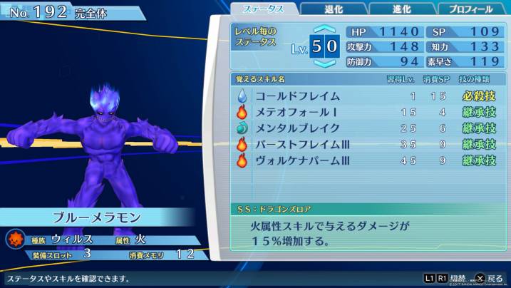 | デーモン | 同じウィルス種ではあるが、デーモンの必殺技威力が上昇し、さらに限定的ではあるがブルーメラモンの知力も飛躍的に上がる。 |