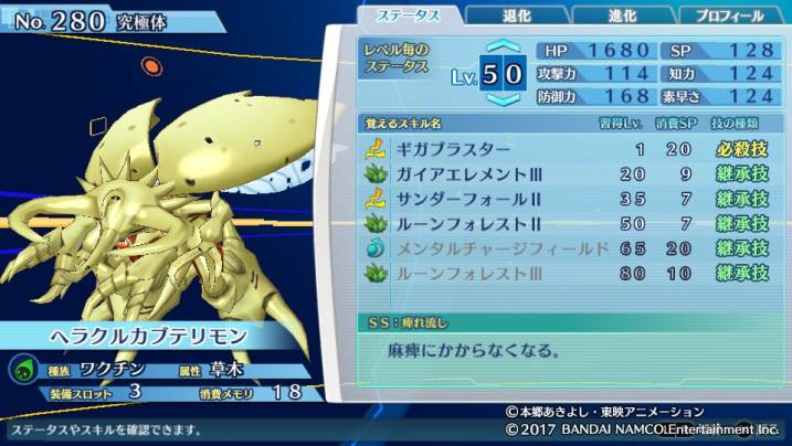 追加効果は無い淡泊な性能。風属性のウィルス種に3倍で通るが、その条件に当てはまる究極体はなんとメルクリモンのみ。