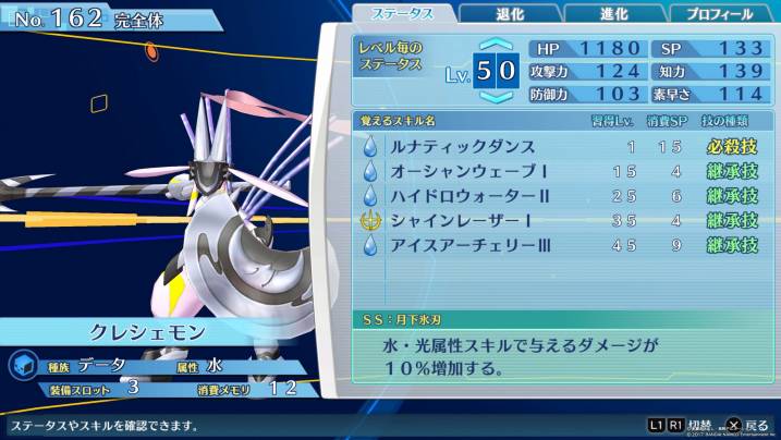 知力アタッカーとして運用するならば、同SS持ちの進化先のディアナモンと被るのが少々難点ではあるが、知力構成であっても『ルナティックダンス』を混乱狙いとして打ち込むのも充分効果的。