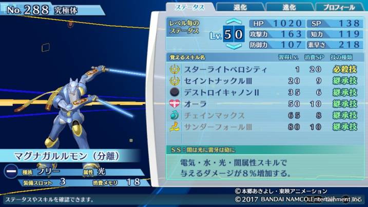 ステータスはより素早さが高くなっており、なんと全デジモン中1位タイの数値である。