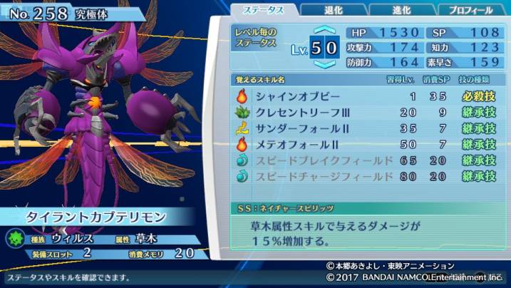 草木属性強化によってデータ種はマリンエンジェモンを、タイラントカブテリモンはディアナモンやメタルシードラモン、プレシオモン等にしっかりと刺す事ができる。ワクチン種も1.5倍でマリンエンジェモンに撃つことと、リヴァイアモンも一応マークできる。