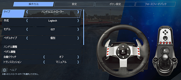 [操作方法]で、お使いのコントローラーを登録します。(Logitech G27の例)