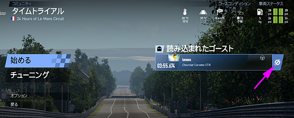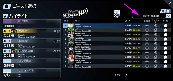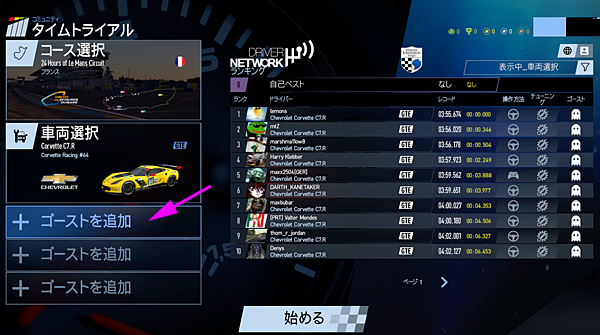 同じ車両のリストの中から一番速い人をゴーストに選んでください。