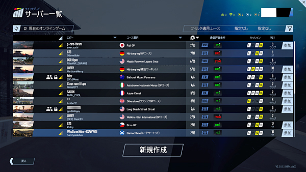 サーバーリストでは、なるべく参加者が集まっているレースを選ぶと良いでしょう。