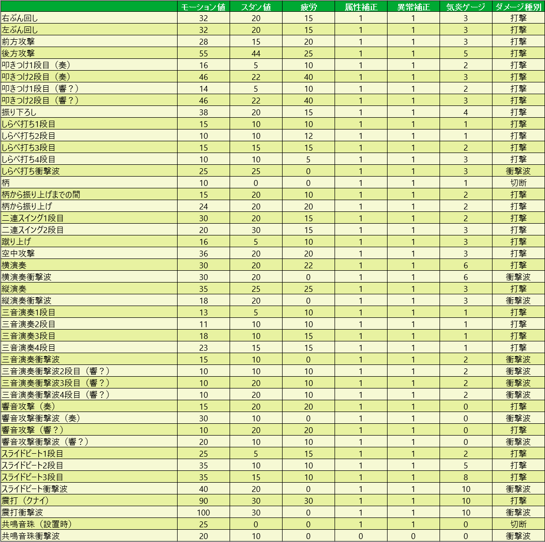 | 衝撃波 | 30 | 27 | - | Riseから肉質無視、Wでの謎倍率1.05が消えて斬れ味補正を受けてそう(青以上で1.05より上がるか要検証) |