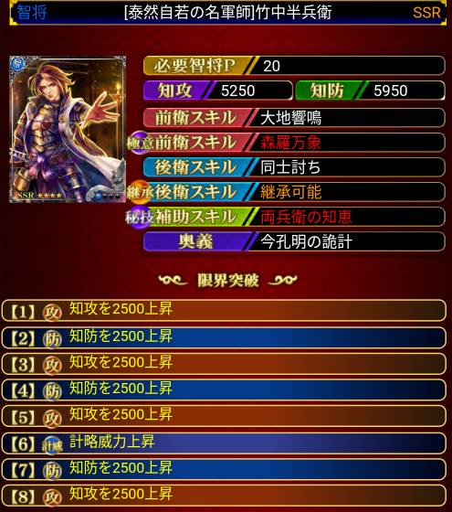ただ、計略スキルの大地響鳴と森羅万象は威力がイマイチ。また、両兵衛の知恵は数を揃えにくく、このカード自身の補助枠が1つだけなのも残念なところ。参謀として1枚あればOK。女孔明があれば星で。
