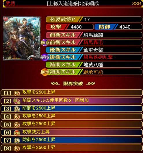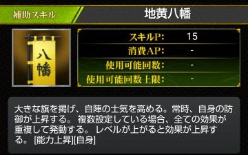 前衛用に補助スキルを充実させたいところですが、もともと持っているものが防御を上げる「地黄八幡」とイマイチ。