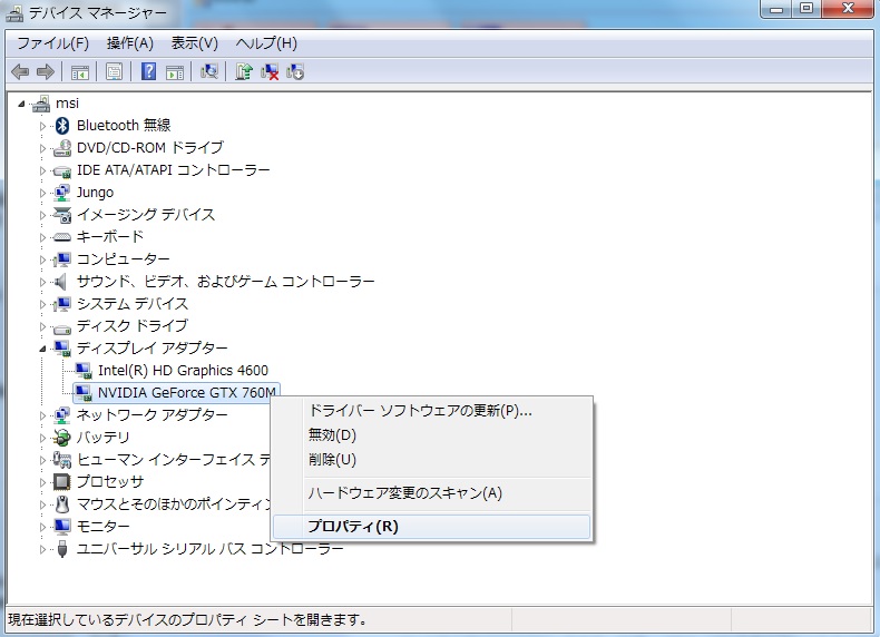 デバイスマネージャーを開いたあとは、ディスプレイアダプターからGeforceのドライバのプロパティを開きます。