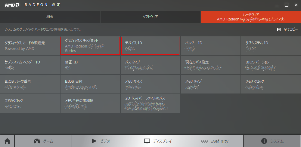 Radeonの場合はドライバーの画面を開き、「システム」→「ハードウェア」を開くとデバイスIDが載っています。