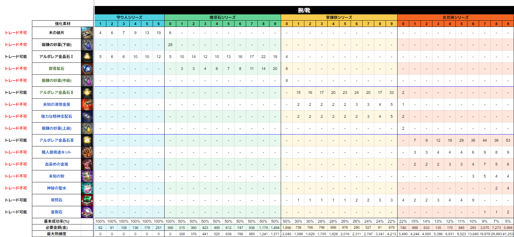 | トレード可否 | 素材 | 魔導石 | 撃錬鉄 | 炎刃哭 | 魔導石 | 撃錬鉄 | 炎刃哭 | |