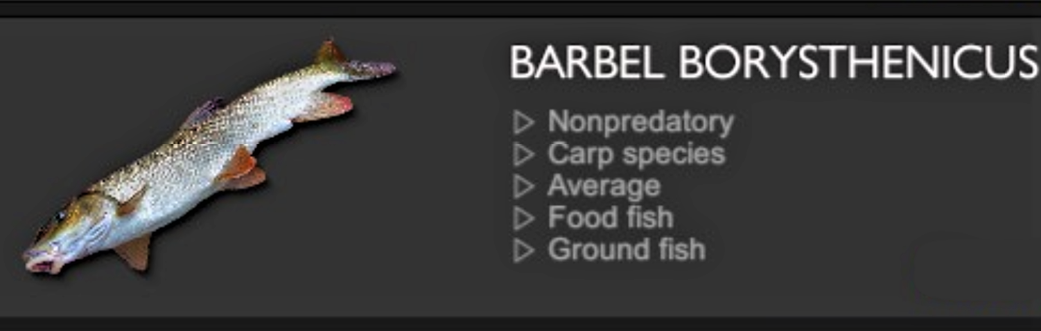 ref | 非捕食 コイ種 中型魚 食用魚 底生魚 | ref#ref(): File not found: "BARBEL BORYSTHENICUS2.jpg" at page "BARBEL BORYSTHENICUS" | 最大重量 4kg ユニークサイズ 緑--kg 青--kg トロフィー--kg |