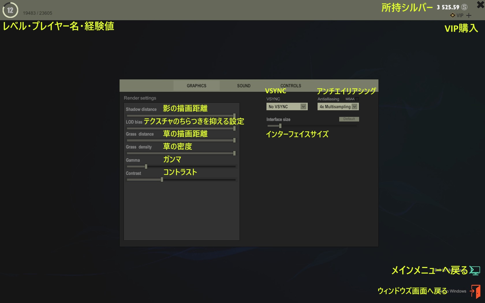 - アンチエイリアシング右側のMSAAとはドットのピクセルのギザギザを取りますが負荷は高くなりますのでPCスペックに応じON/OFFしてください。