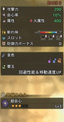 攻撃【大】防御【大】、スタミナ回復の響玉と旋律傾向も似通っている。武器が会心系で活かしにくいところまで一緒。