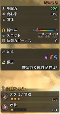 また、旋律の防御UP【大】+響玉の防御力&耐性UPで防具の防御力を1.32倍にできるオンリーワンな特技を持つ。