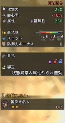 龍属性武器だが、切れ味に白ゲージさえ出せばその物理性能から無属性の狩猟笛として見てもすこぶる優秀。
