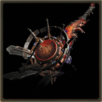 ドシャグマ素材で作成できる無属性の狩猟笛。演奏時に太鼓のバチ部分がポコポコ動くギミックつき。