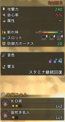 旋律面では体力回復+聴覚保護【大】+響玉も体力回復に生命の調べという回復特化でやや毛色は異なる。