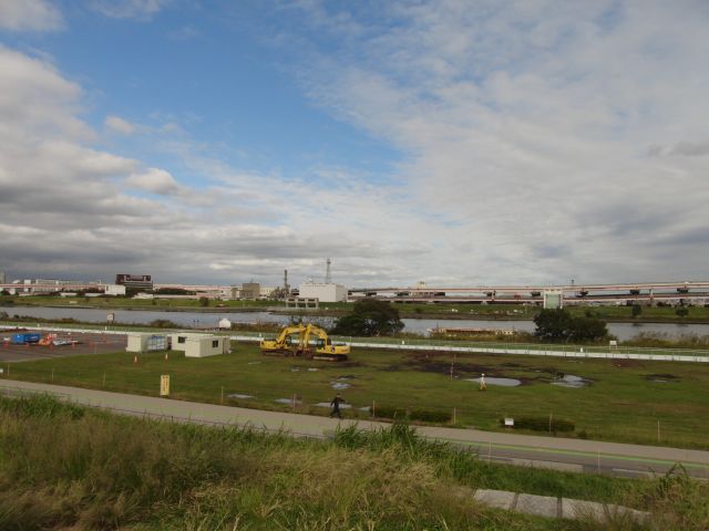 工場から東へ行くと荒川にぶつかります。由依さんが歩いているシーンがある河川敷では補強工事が行われていました。